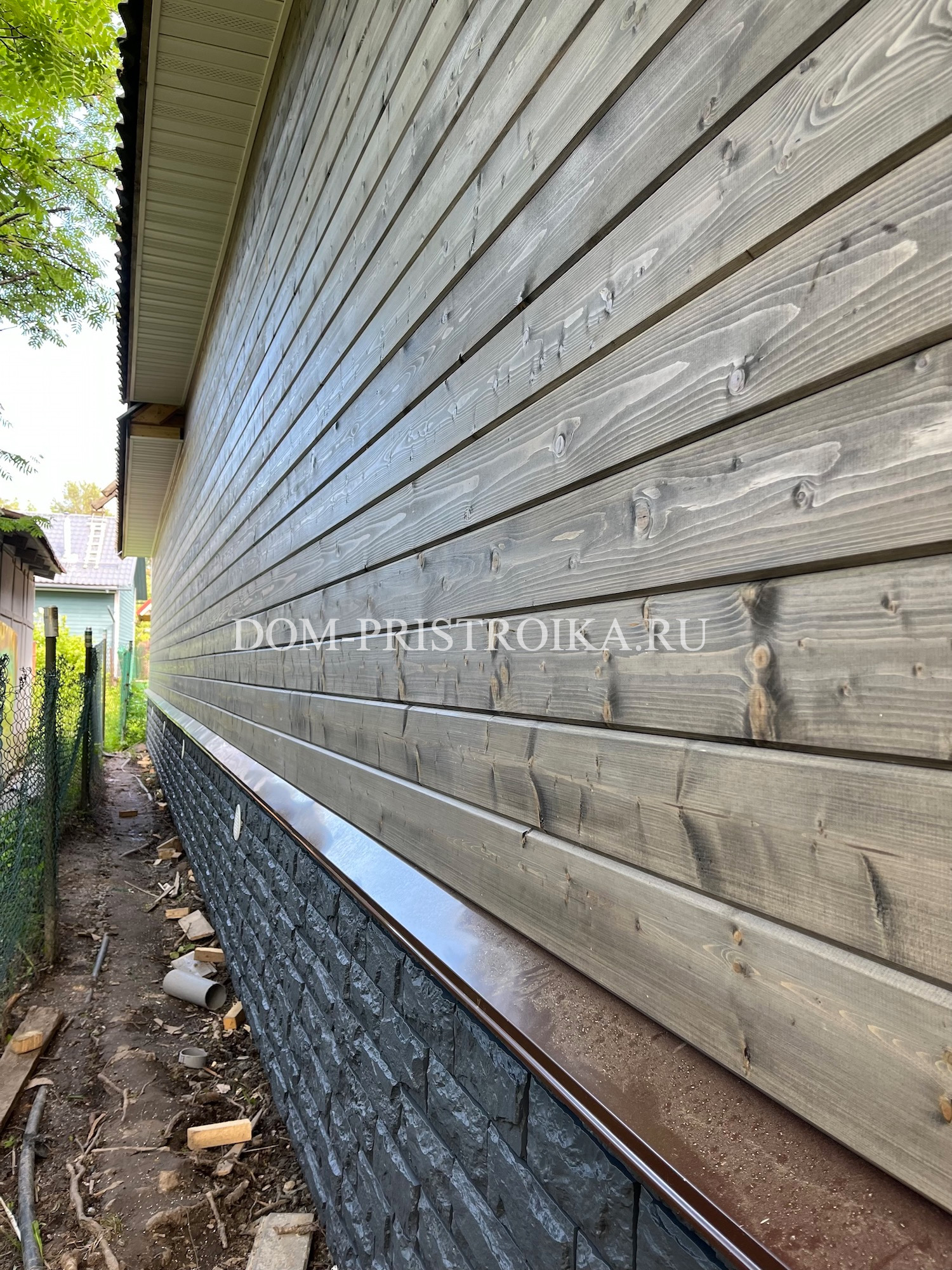 - Отделка цоколя панелями "Docke Premium Stein" (темный орех)